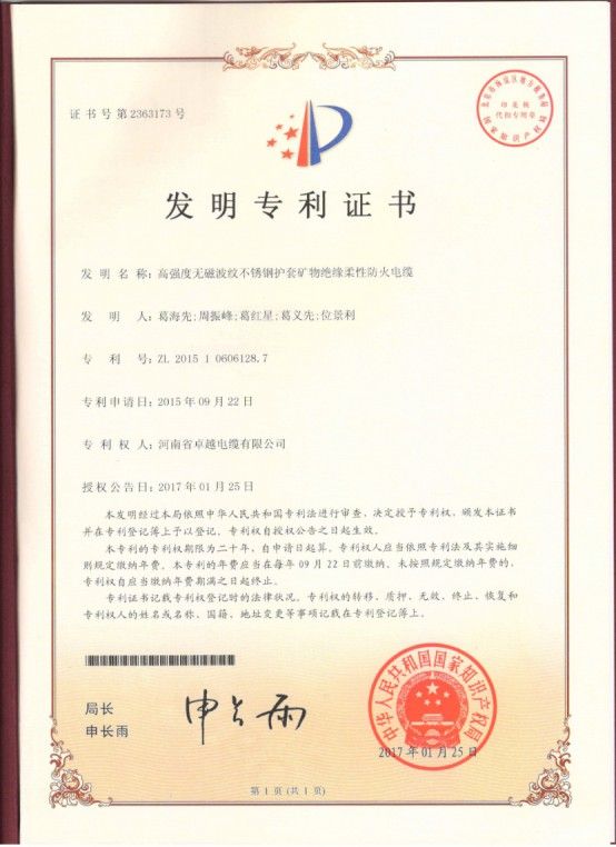 喜訊——“無機(jī)防火套型礦物絕緣柔性防火電纜”獲國(guó)家發(fā)明**